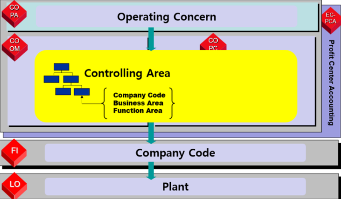 예를들면 A회사를 하나의 OC라고 보면 아시아 지부를 Controlling Area / 유럽 지부를 다른 CA로 봤을 때 CA는 Company Code 기준으로 재무제표를 산출해야만하는 단위이므로 각 회사코드별 CA에 집계된 여러 내역의 수익성 분석을 위한 단위가 OC가 될 수 있습니다.